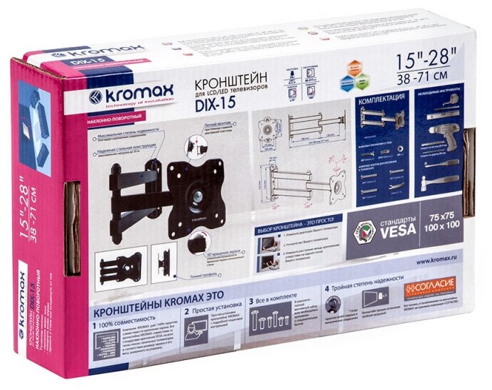 Кронштейн наклонно-поворотный Kromax DIX-15 10-28' до 30кг Vesa до 100x100 черный
