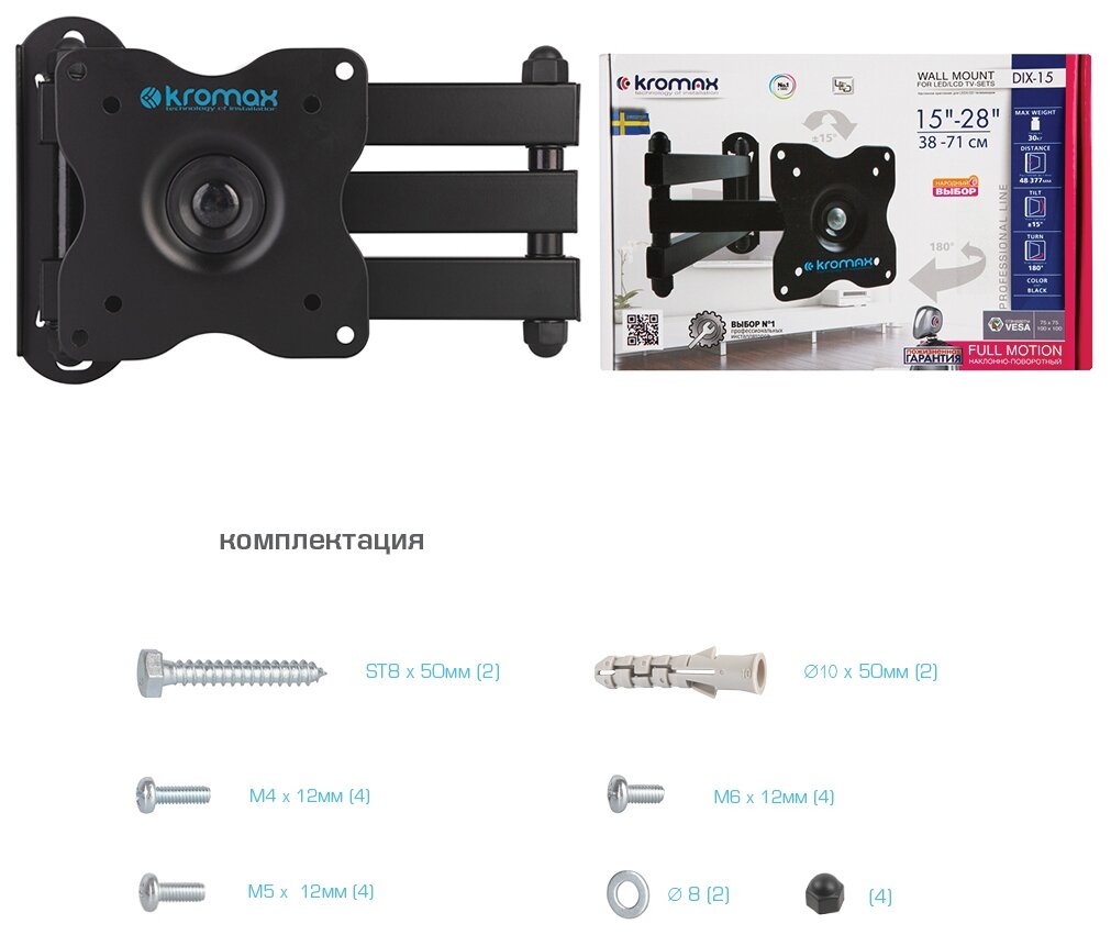 Кронштейн для телевизора Kromax DIX-15, 15-28", настенный, поворот и наклон, черный [20202]