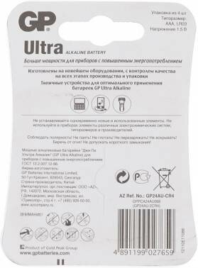 Батарейка GP Ultra Alkaline 24AU-2CR4, типоразмер ААА, 4 шт