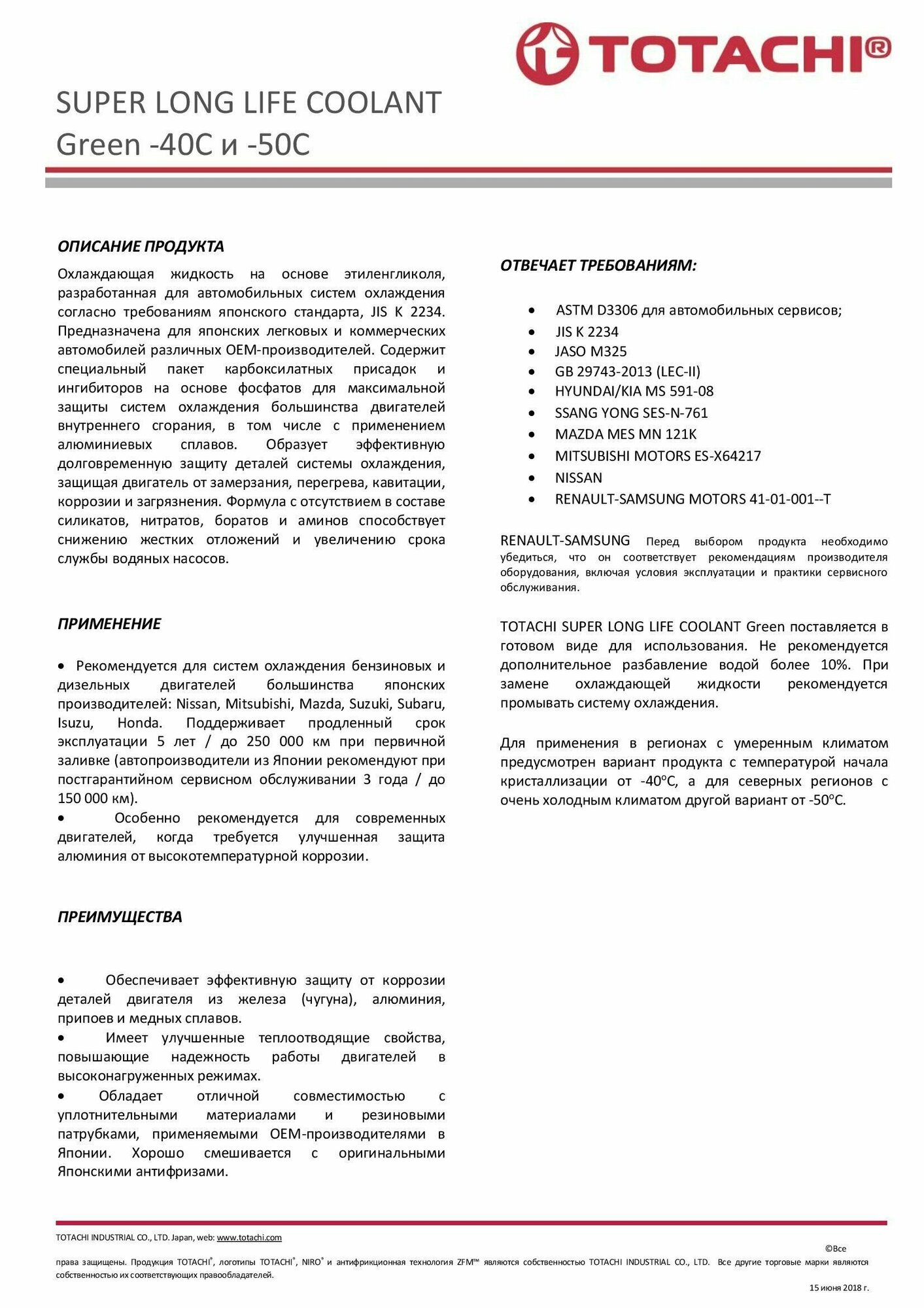 TOTACHI 41602 Жидкость охлаждающая низкозамерзающая TOTACHI SUPER LONG LIFE COOLANT Green -40C 2л