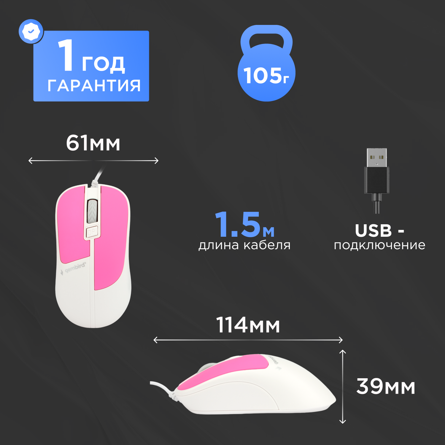 RZTK Мышь проводная Gembird Mop-410p, USB, розовая, 1600dpi мышки в Курчатов
