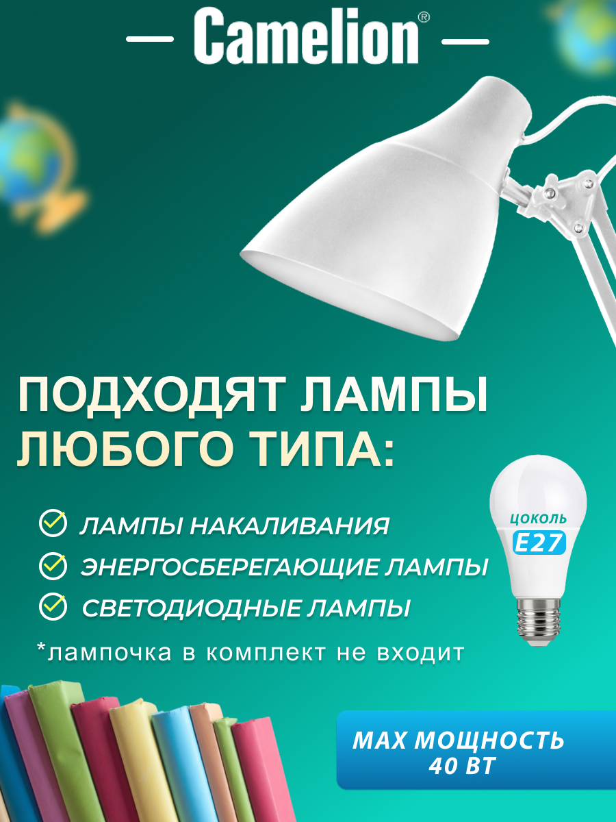 Светильник настольный Camelion KD-335 C01 белый с метал. струбциной, 230V, 40W, E27 KD-335 C01