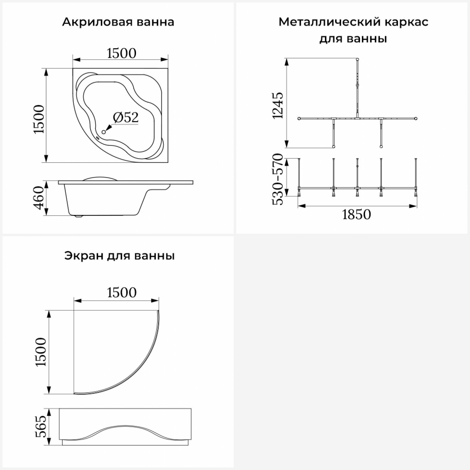 Акриловая ванна 150х150 см Lavinia Boho Aveo набор 3 в 1 S2-37040150: угловая ванна, металлический каркас, лицевой экран