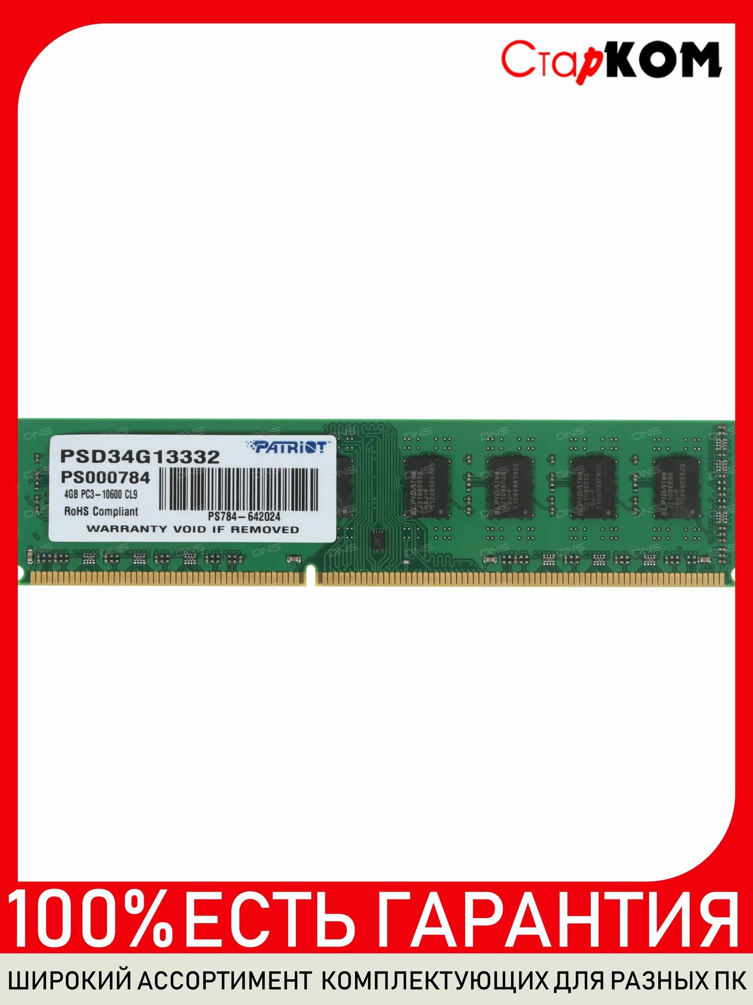 Модуль памяти DDR3 4GB Patriot Memory PSD34G13332 PC3-10600 1333MHz CL9 1.5V RTL