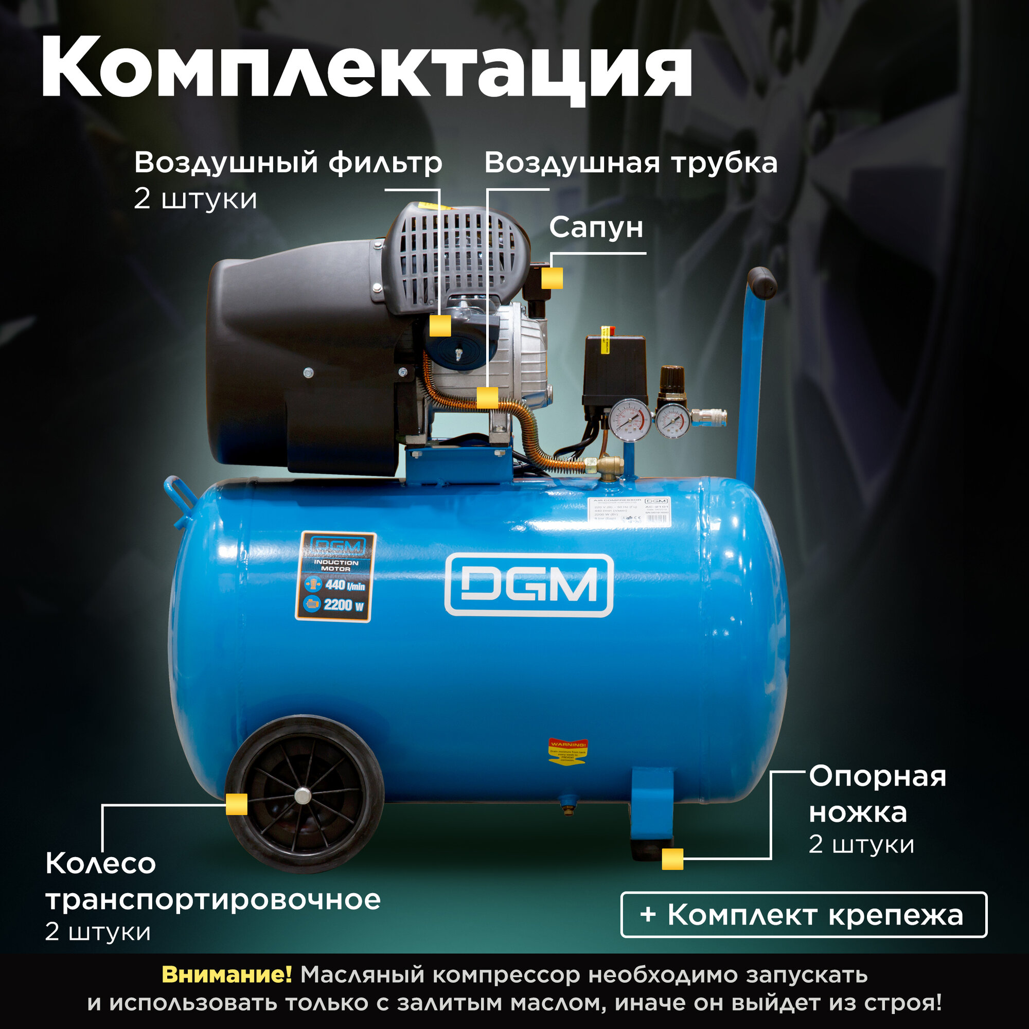 Компрессор воздушный масляный DGM AC-2101 (440 л/мин, 8 атм, коаксиальный, ресив. 100 л, 220 В, 2.20 кВт)