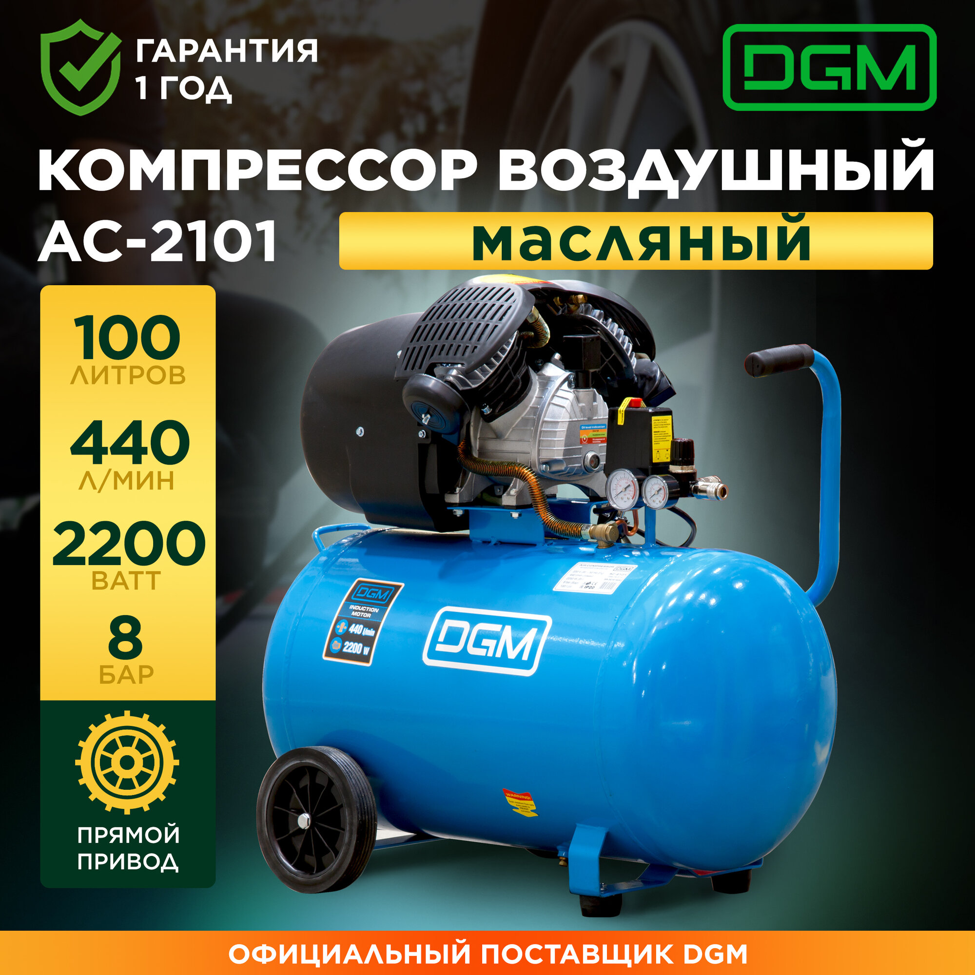 Компрессор DGM AC-2101 (440 л/мин, 8 атм, коаксиальный, масляный, ресив. 100 л, 220 В, 2.20 кВт)