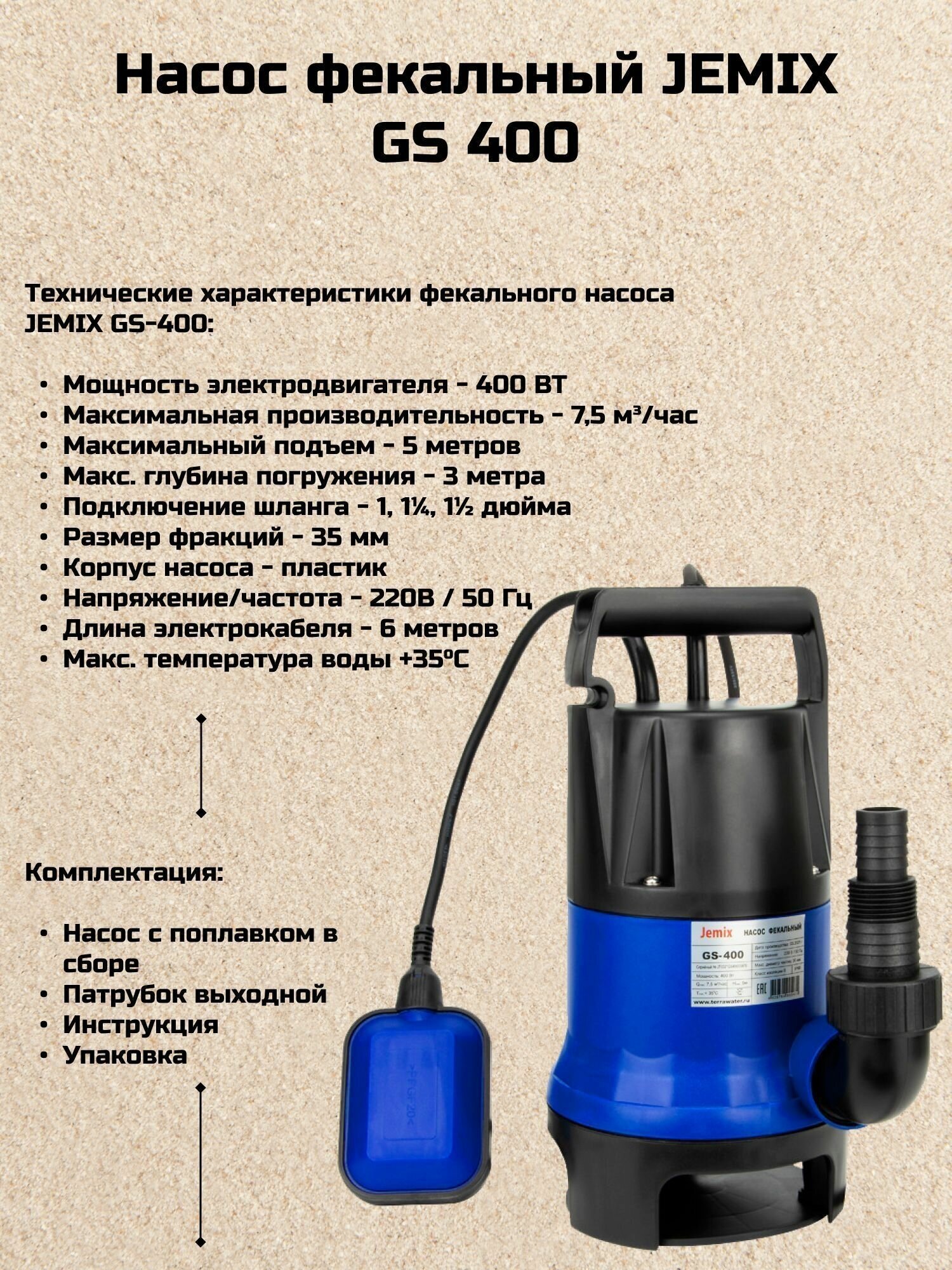 Насос фекальный JEMIX GS-400, 400 Вт, напор 5 м, 125 л/мин, диаметр частиц 35 мм