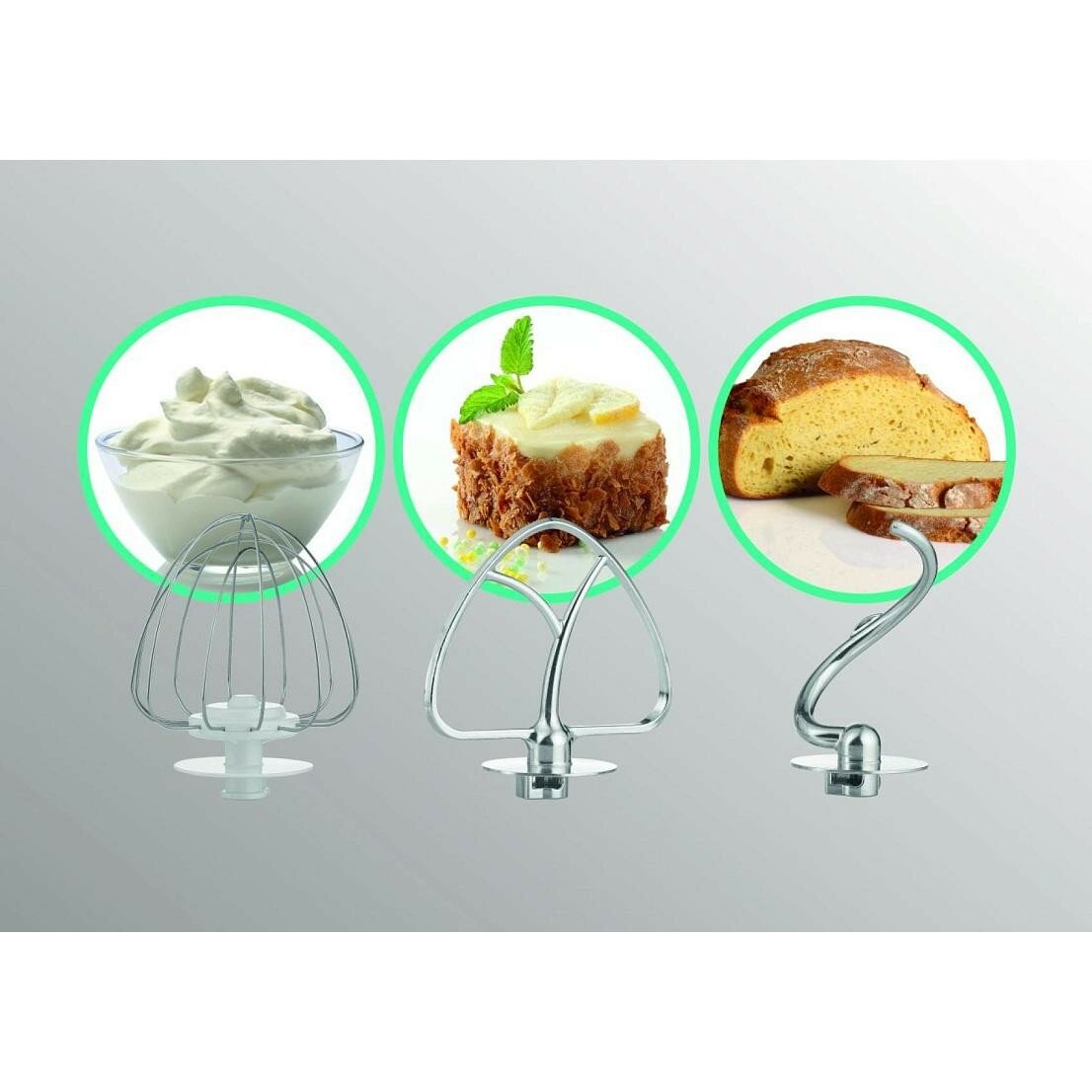 - венчик для взбивания / биттер для перемешивания / силиконовый биттер / насадка / крюк для замеса теста / 3 диска для фарша / насадка для кеббе / насадка для домашних колбас / насадка для печенья / 4 насадки для нарезки/шинковки