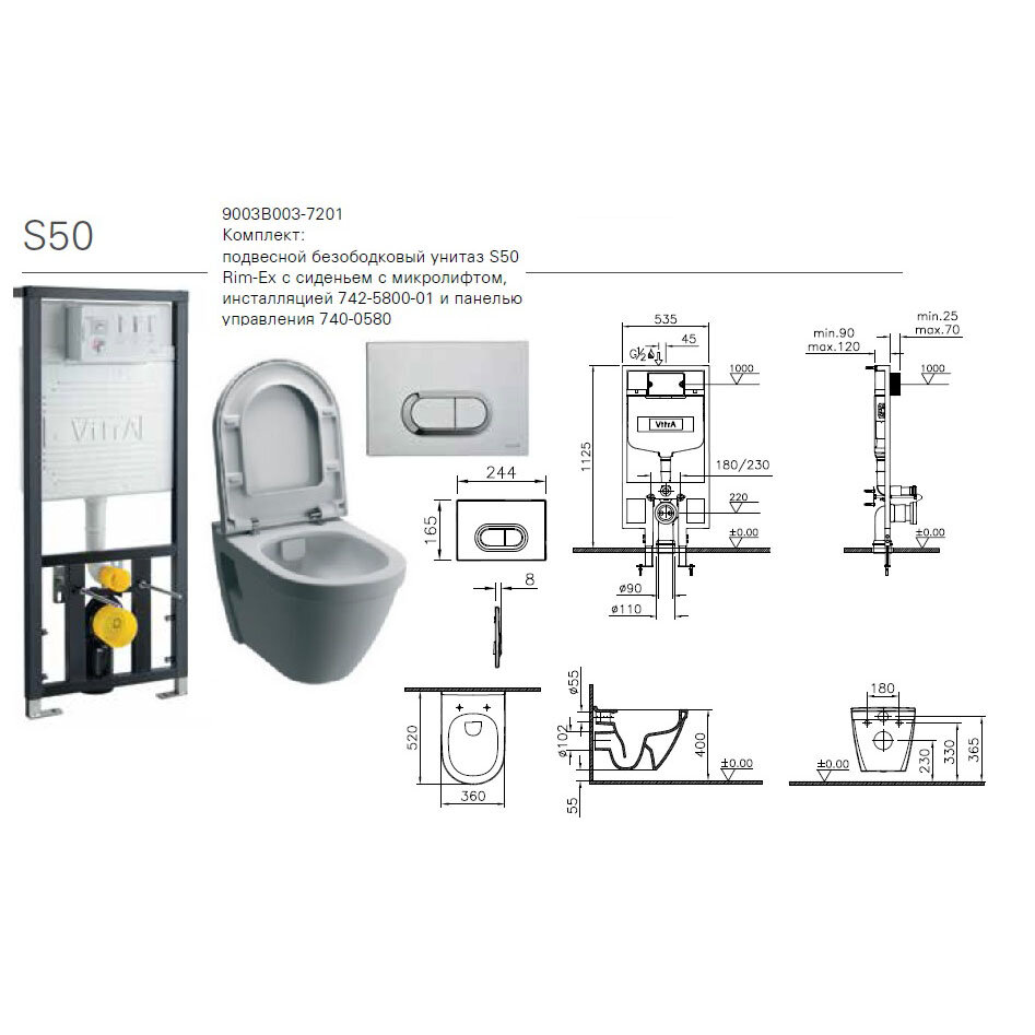 Комплект с инсталляцией Vitra S50 унитаз с технологией Rim-Ex, инсталляция, кнопка, сиденье с микролифтом 9003B003-7201