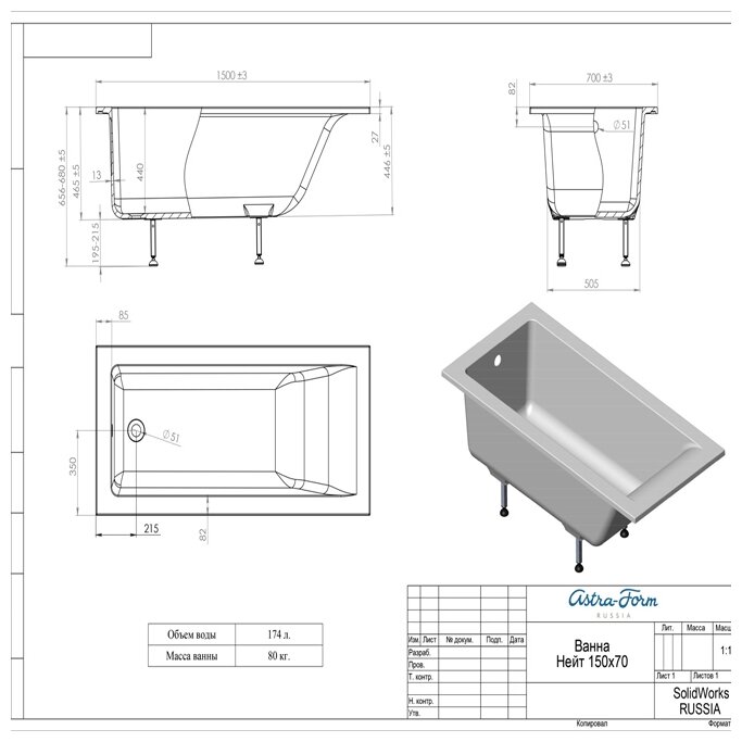 Ванна Astra-Form Нейт 150x70 в комплекте с ножками