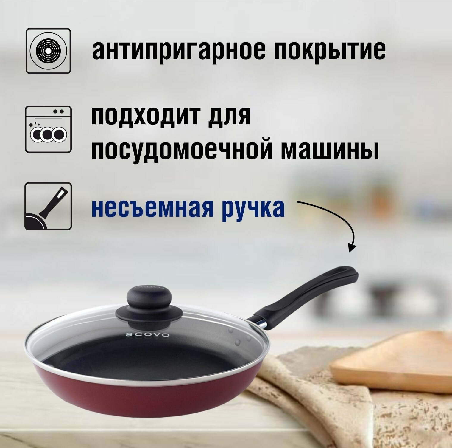 Сковорода SCOVO expert СЭ-028 стеклянная крышка, 24 см, красный