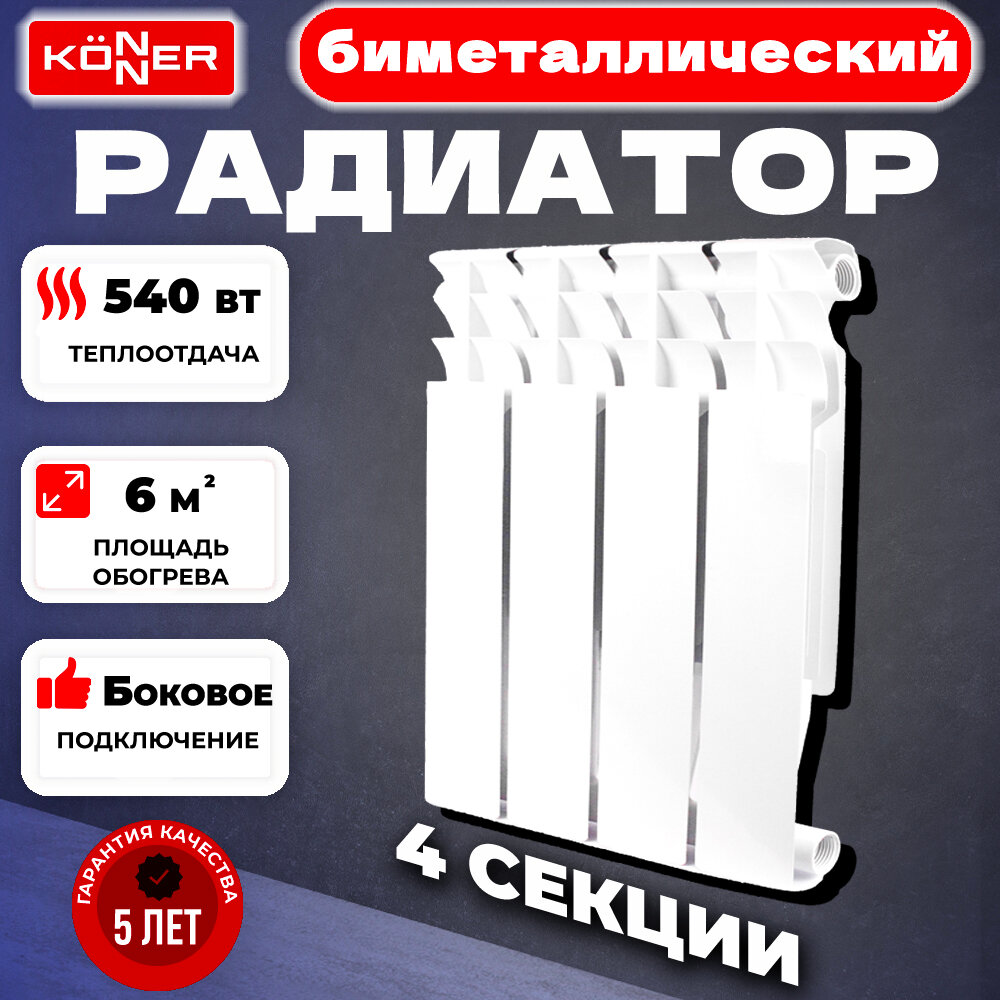 Konner Радиатор отопления биметаллический (батарея) KONNER Bimetal-80/500, 4 секции радиаторы отопления в Курчатов