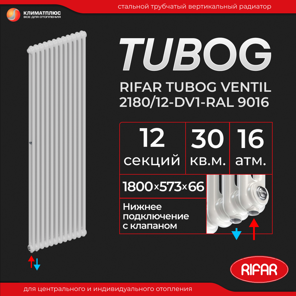 Радиатор отопления Rifar Tubog Ventil 2180 / 6 секций, нижнее подключение, вертикальный, трубчатый, цвет белый Ral 9016
