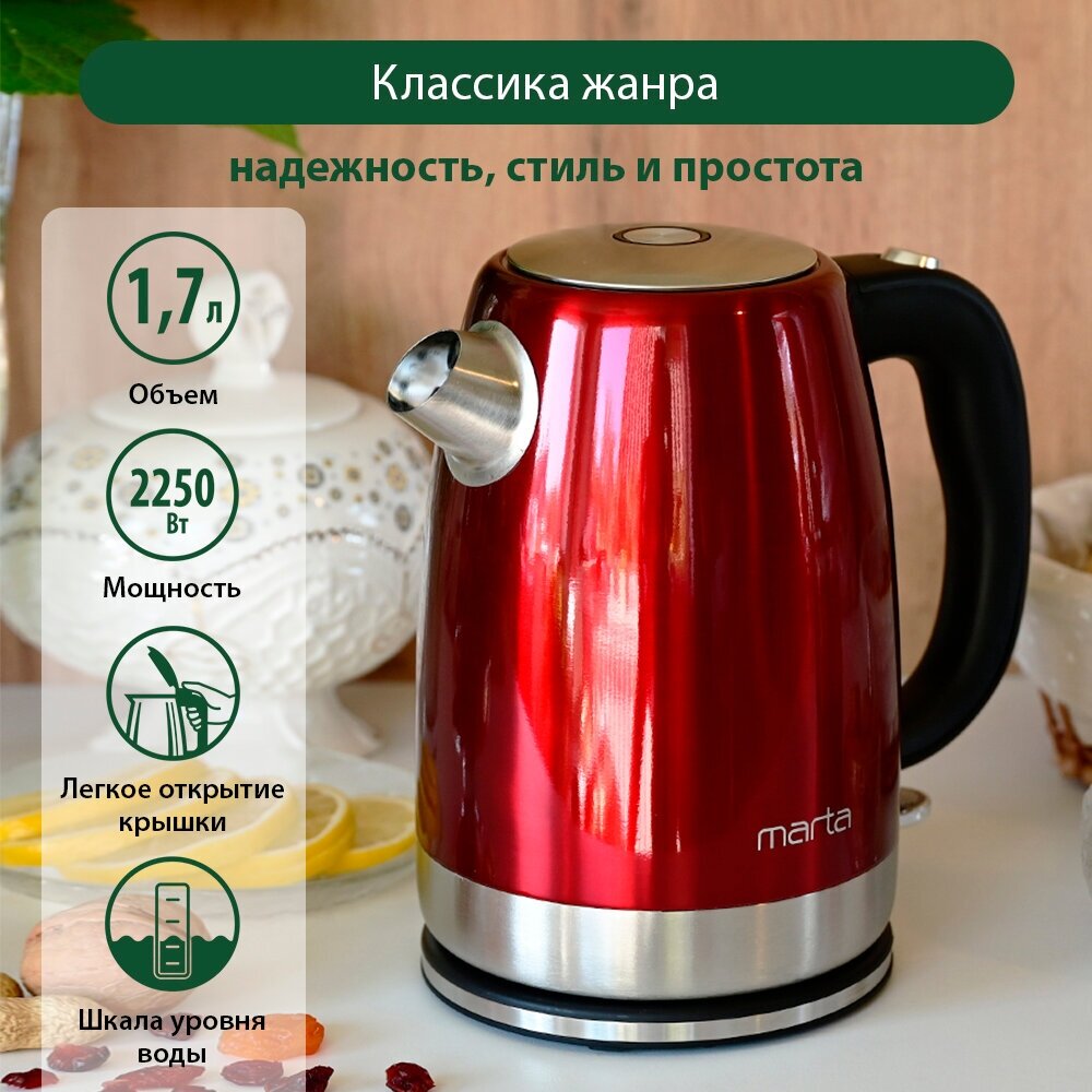 Чайник Marta MT-4560 красный рубин Мощность-2250W Объем-1,7л, шкала уровня воды, автоотключение при .