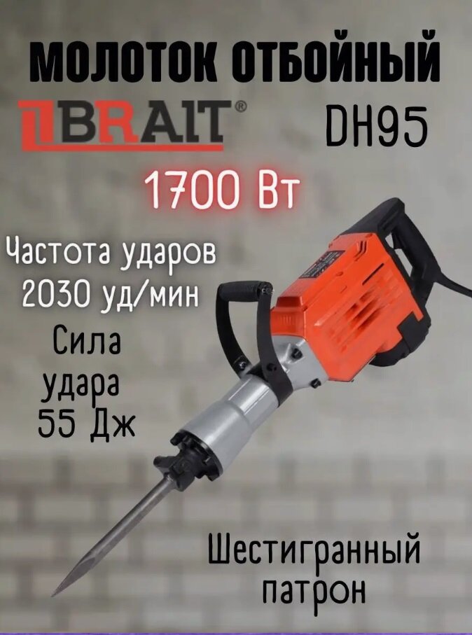 Молоток отбойный электрический BRAIT DH95 (отбойник 1700 Вт, 55 Дж, 220В/50Гц, шестигранный патрон)