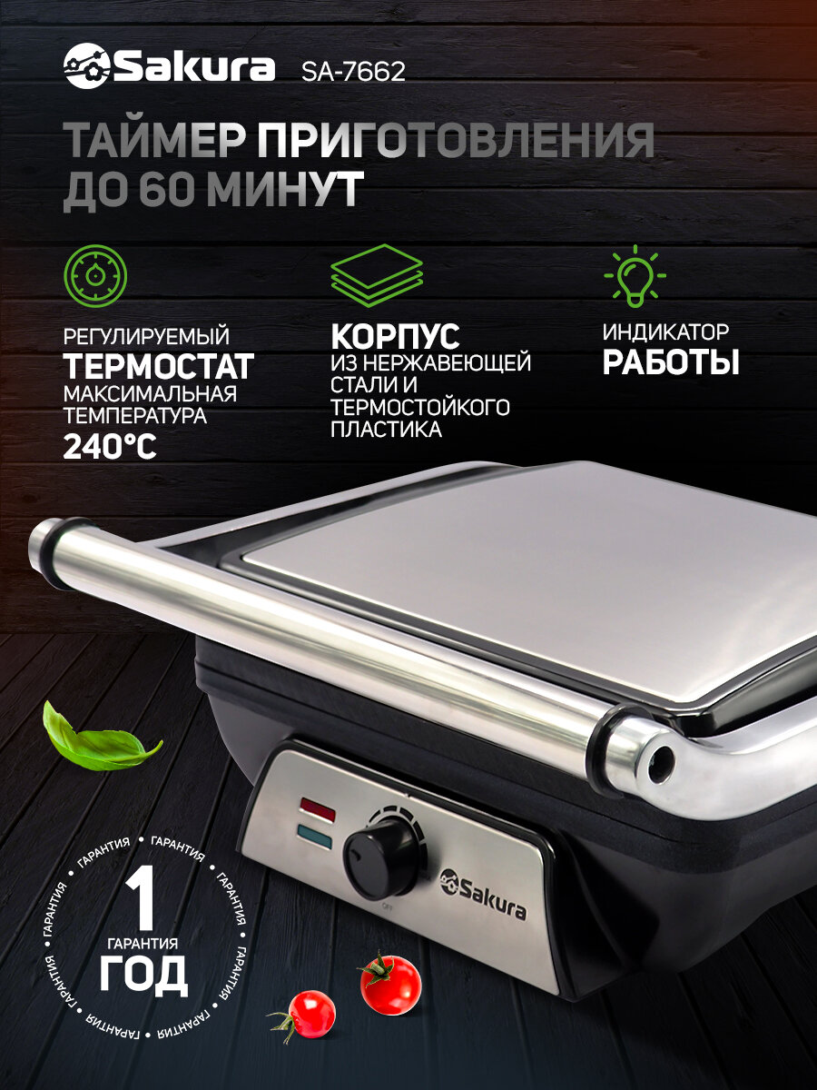 Sakura Гриль SAKURA SA-7663 с антипригарным покрытием, 1000 Вт, черный электрогриль в Курчатов