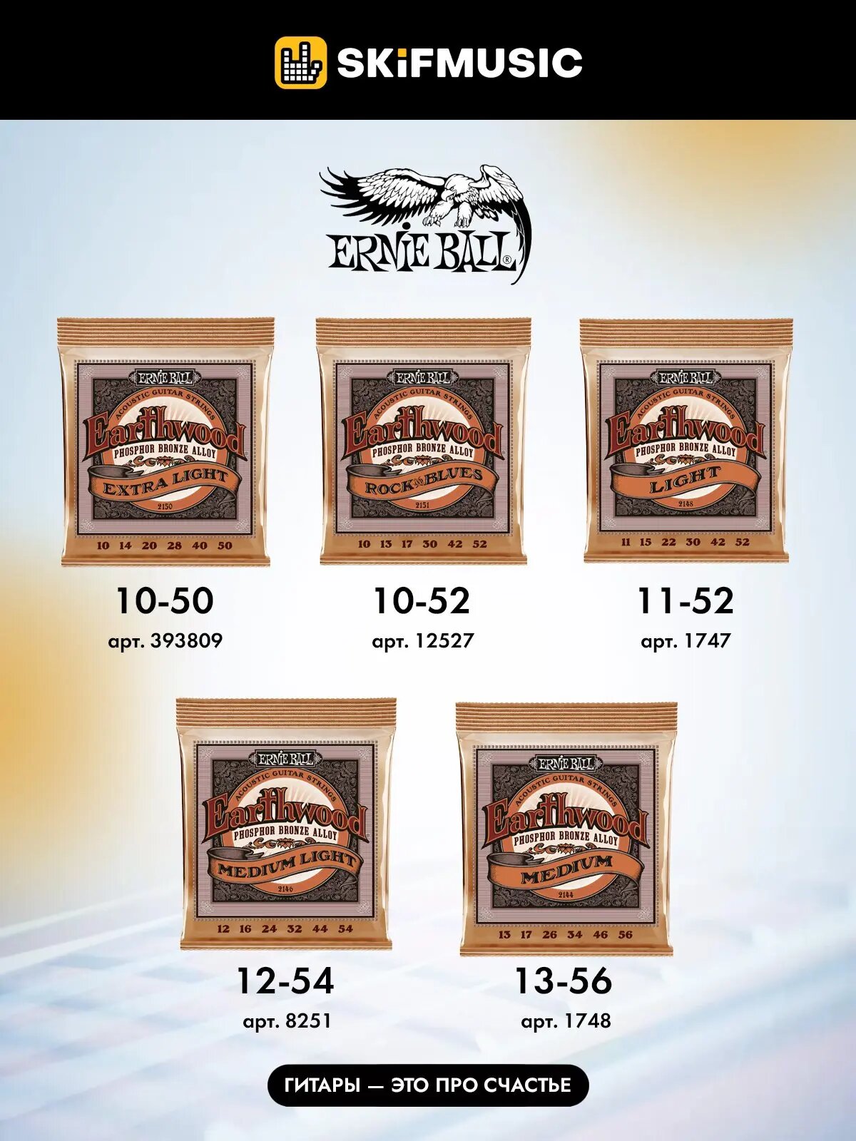 Martin Струны для акустической гитары, комплект из 6 струн, фосфорная бронза, Ernie Ball 2144 Earthwood 13-56 струны в Курчатов