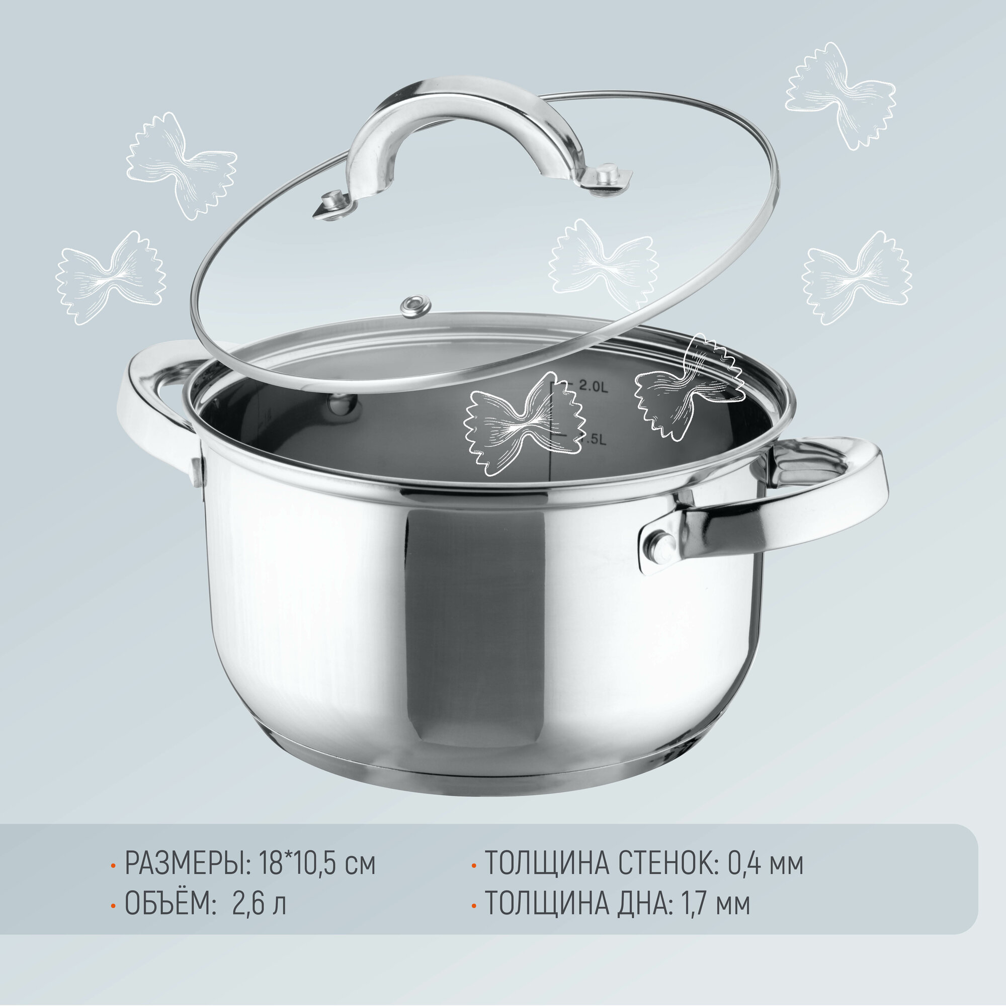 Кастрюля Mediano из нержавеющей стали с крышкой, объем 2,6 л, диаметр 18 см