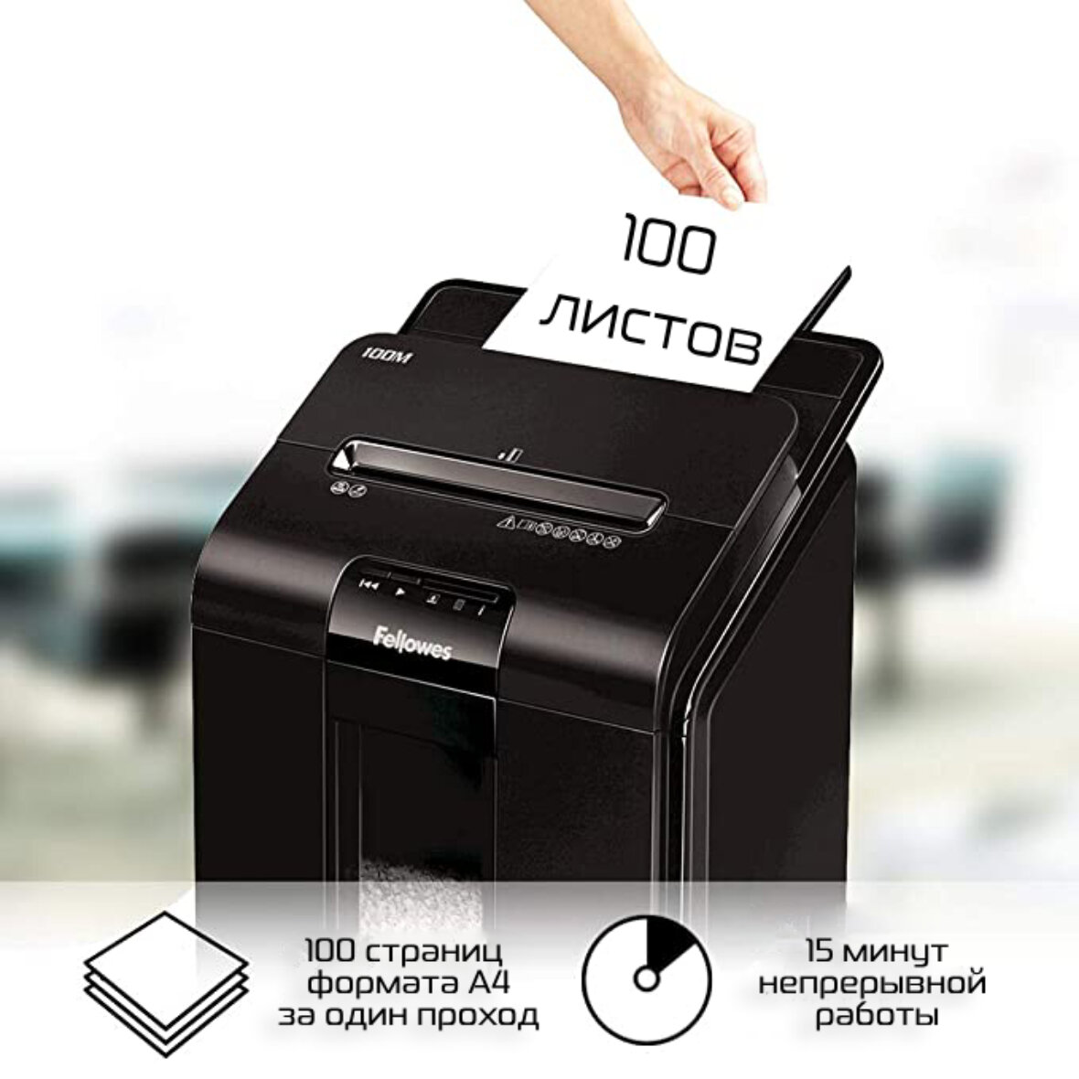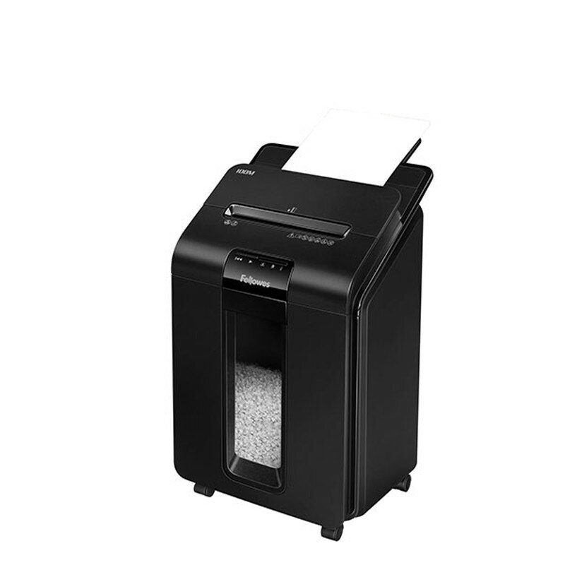 Шредер Fellowes AutoMax 100M, минирезка, DIN P-4, 4х10 мм, автоподача 100 лст., 23 лтр., автореверс, уничт.: скобы, скрепки, пл. карты.