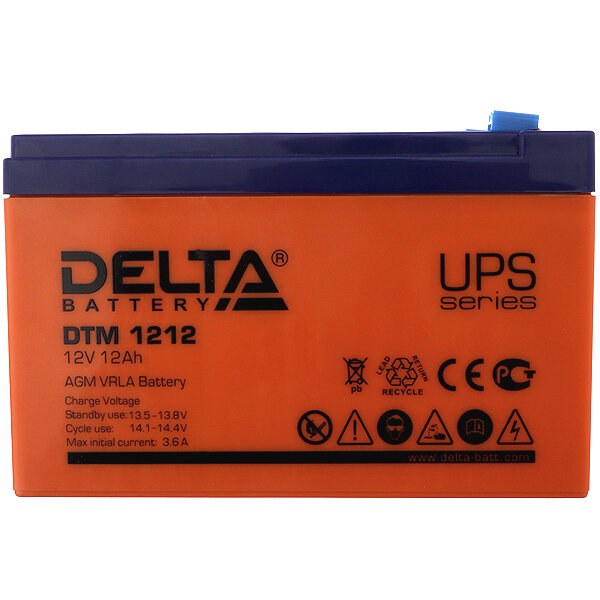 Батарея DELTA серия DTM, DTM 1212, напряжение 12В, емкость 12Ач (разряд 20 часов), макс. ток разряда (5 сек.) 180А, макс. ток заряда 3.6А, свинцово-кислотная типа AGM, клеммы F2, ДxШxВ 151х98х95мм., вес 3.8кг., срок службы 6 лет. Delta UPS DTM 1212 (12V