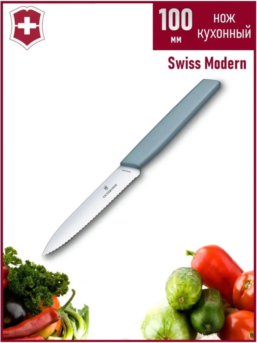 Нож кухонный Victorinox Swiss Modern, универсальный, 100мм, заточка серрейтор, стальной, мятный [6.9006.10w21]