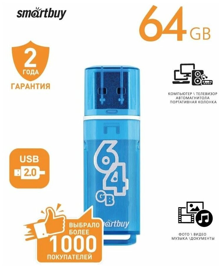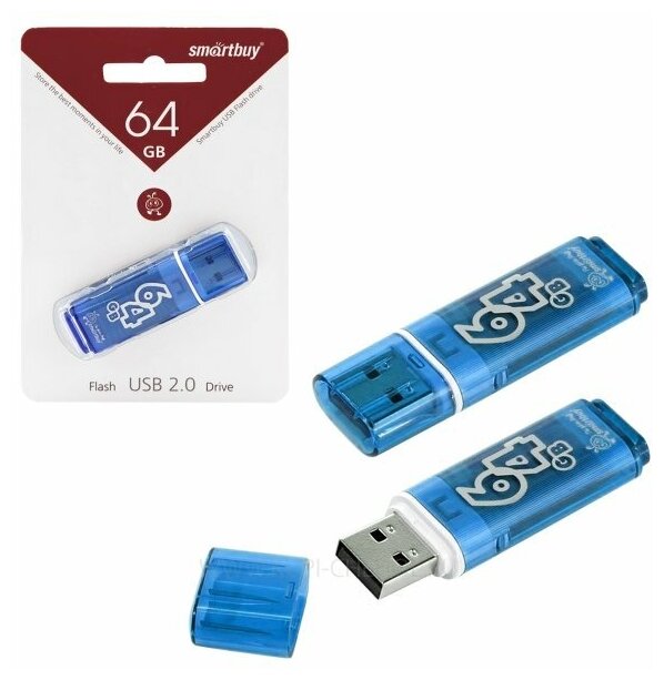 2 шт. Память Smart Buy "Glossy" 64GB, USB 2.0 Flash Drive, голубой