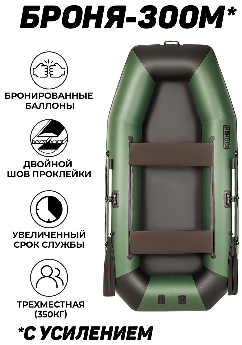 Надувная лодка пвх Броня-300М с усилением зеленый-черный