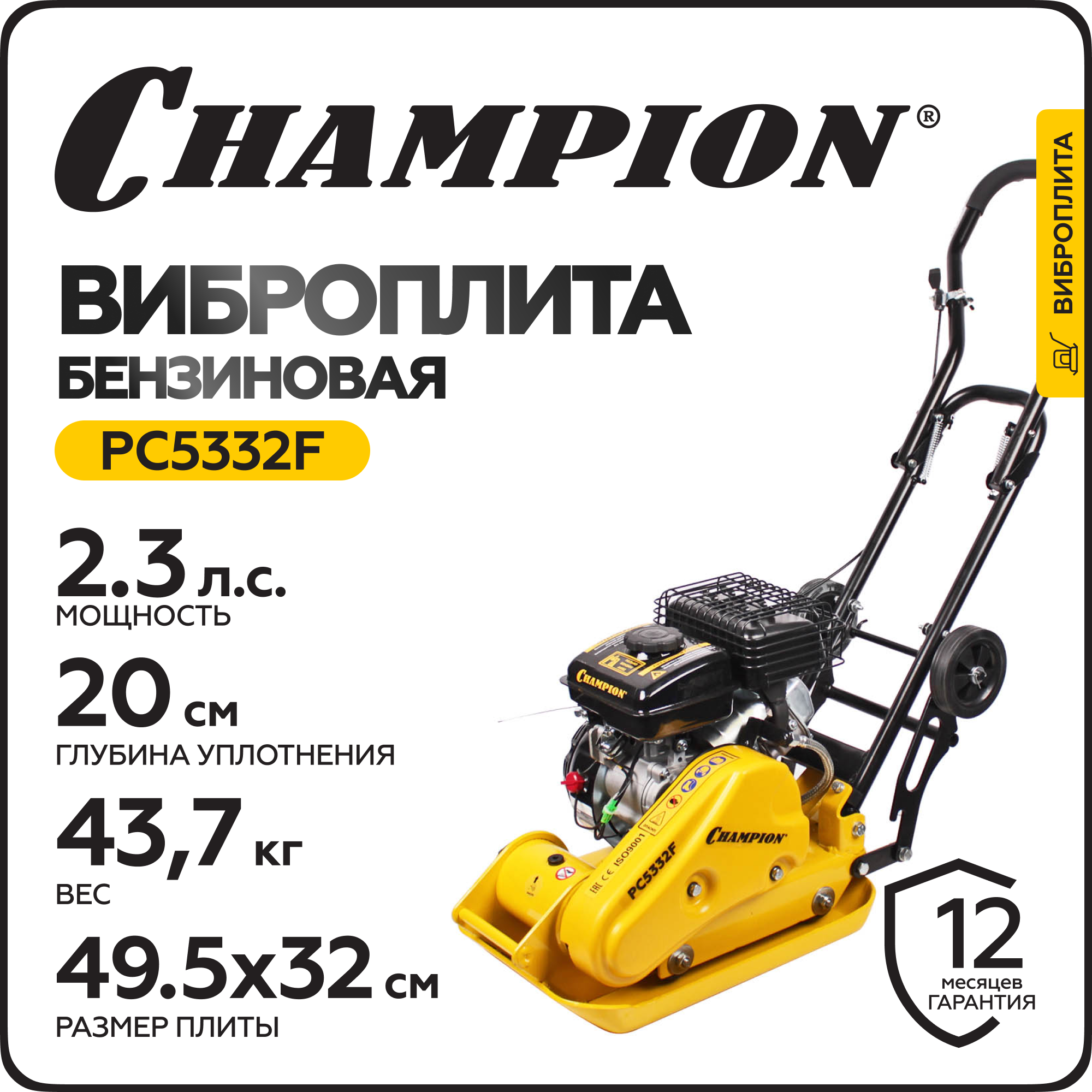 Виброплита бензиновая CHAMPION PC5332F (43,7кг8,2кН49,5*32см20см480м2/час1,65кВт)