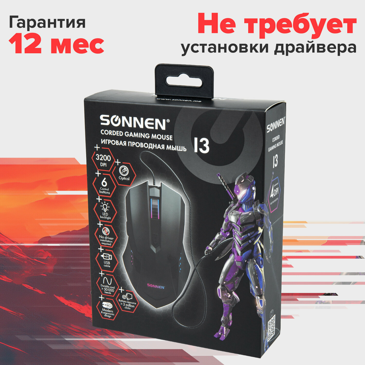 Мышь проводная игровая SONNEN I3 пластик 6 кнопок 800-3200 dpi LED-подсветка черная, 1 шт