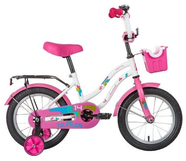 NOVATRACK TETRIS 14" (2020) (Велосипед NOVATRACK 14" TETRIS розовый, тормоз нож, крылья цвет, багажник, корзина, полная защ.цепи)
