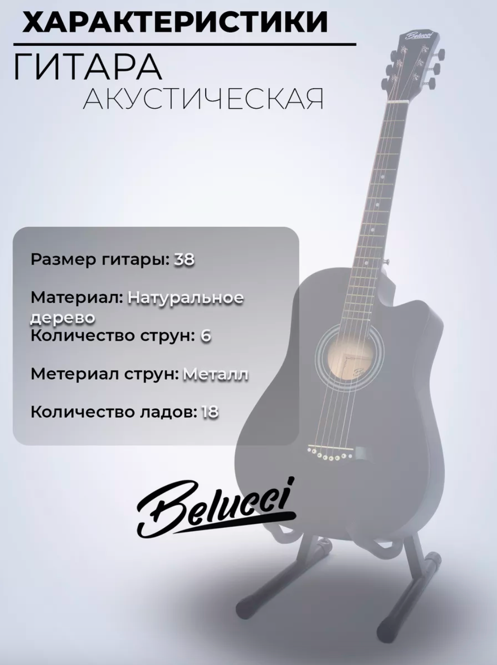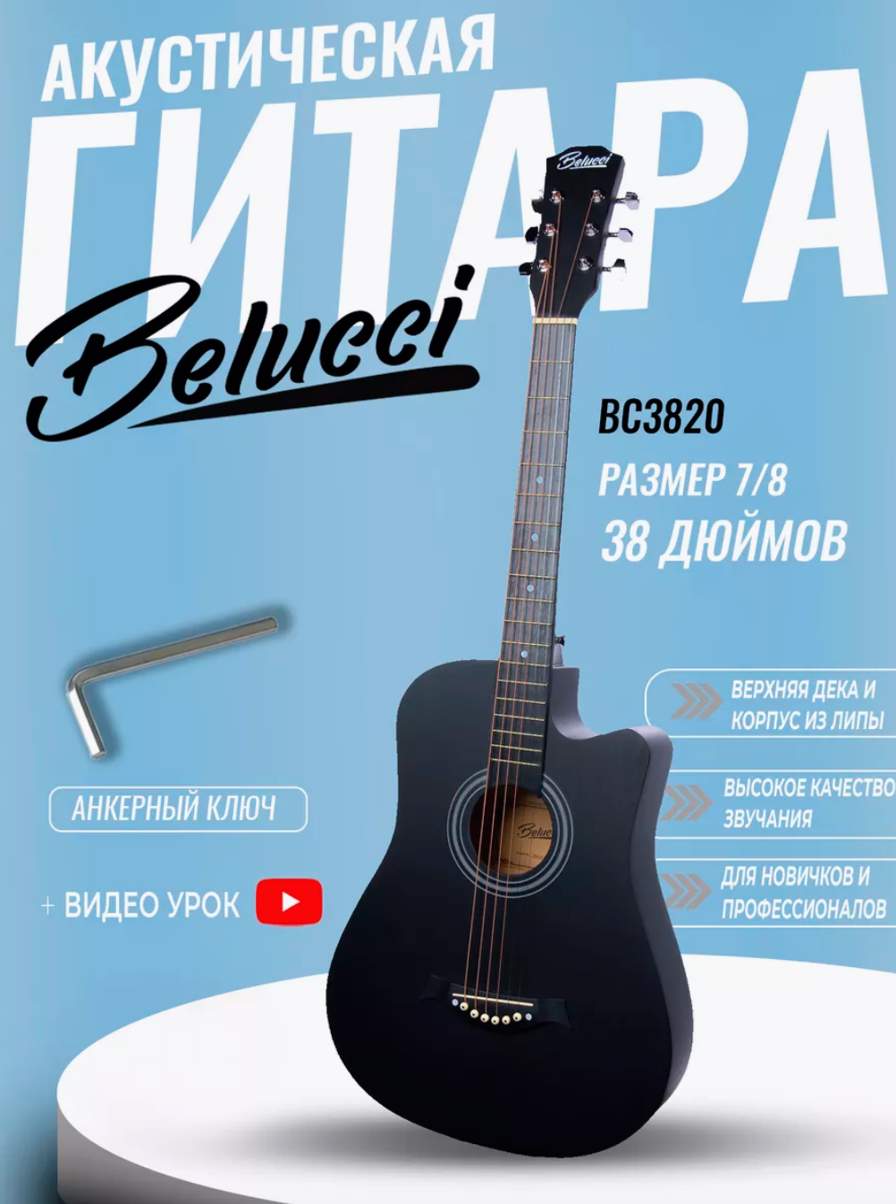 Гитара акустическая для начинающих Belucci шестиструнная с металлическими струнами и анкером. Размер 7/8. Белуччи BC3820 BK