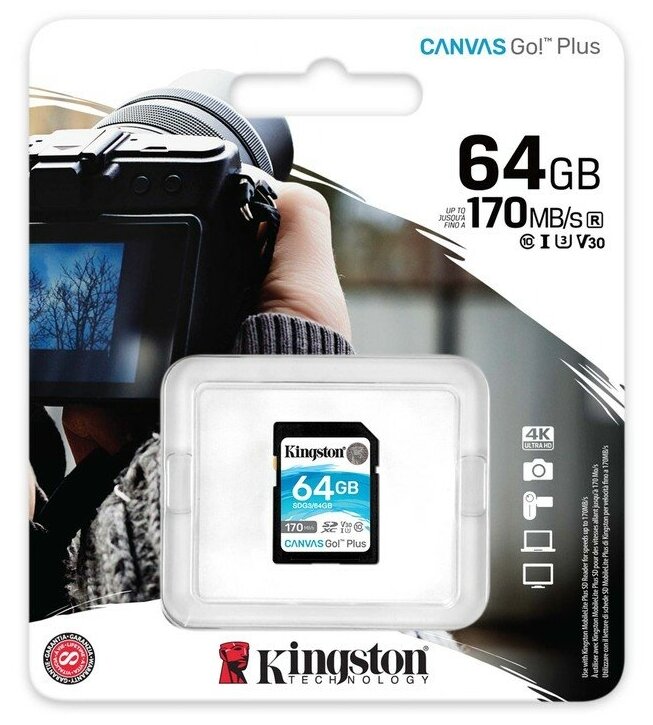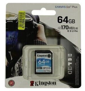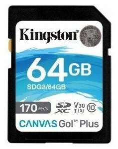 Карта памяти Kingston Canvas Go Plus, SDXC, 64 гб, UHS-I U3, 170 Мб/с, класс 10 (SDG3/64GB)