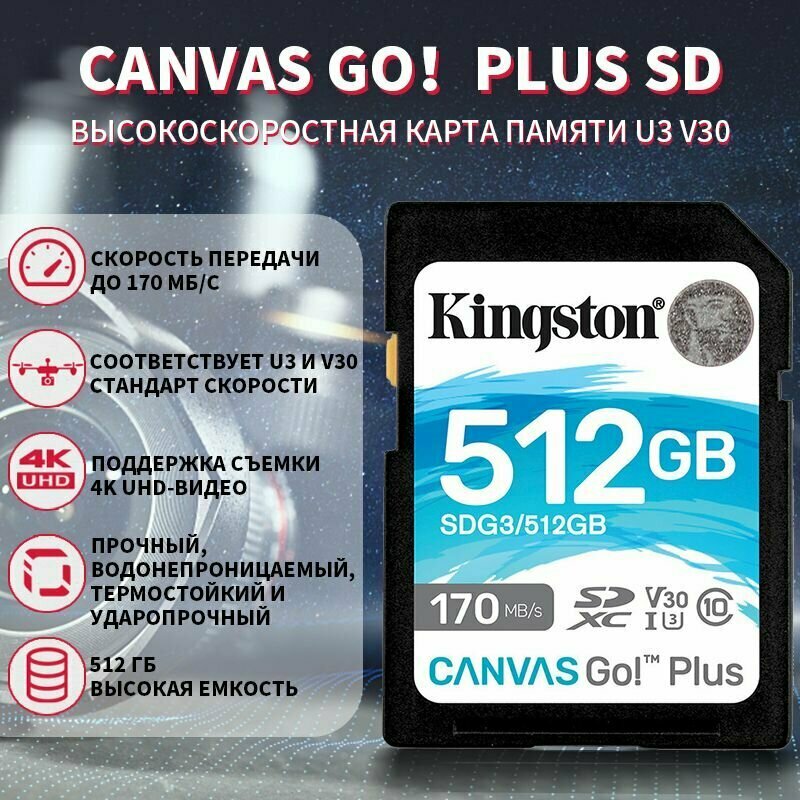 Карта Памяти 512Gb Kingston Canvas Go Plus Sdxc Uhs-i U3 V30 (170/90 Mb/s) Sdg3/512gb .