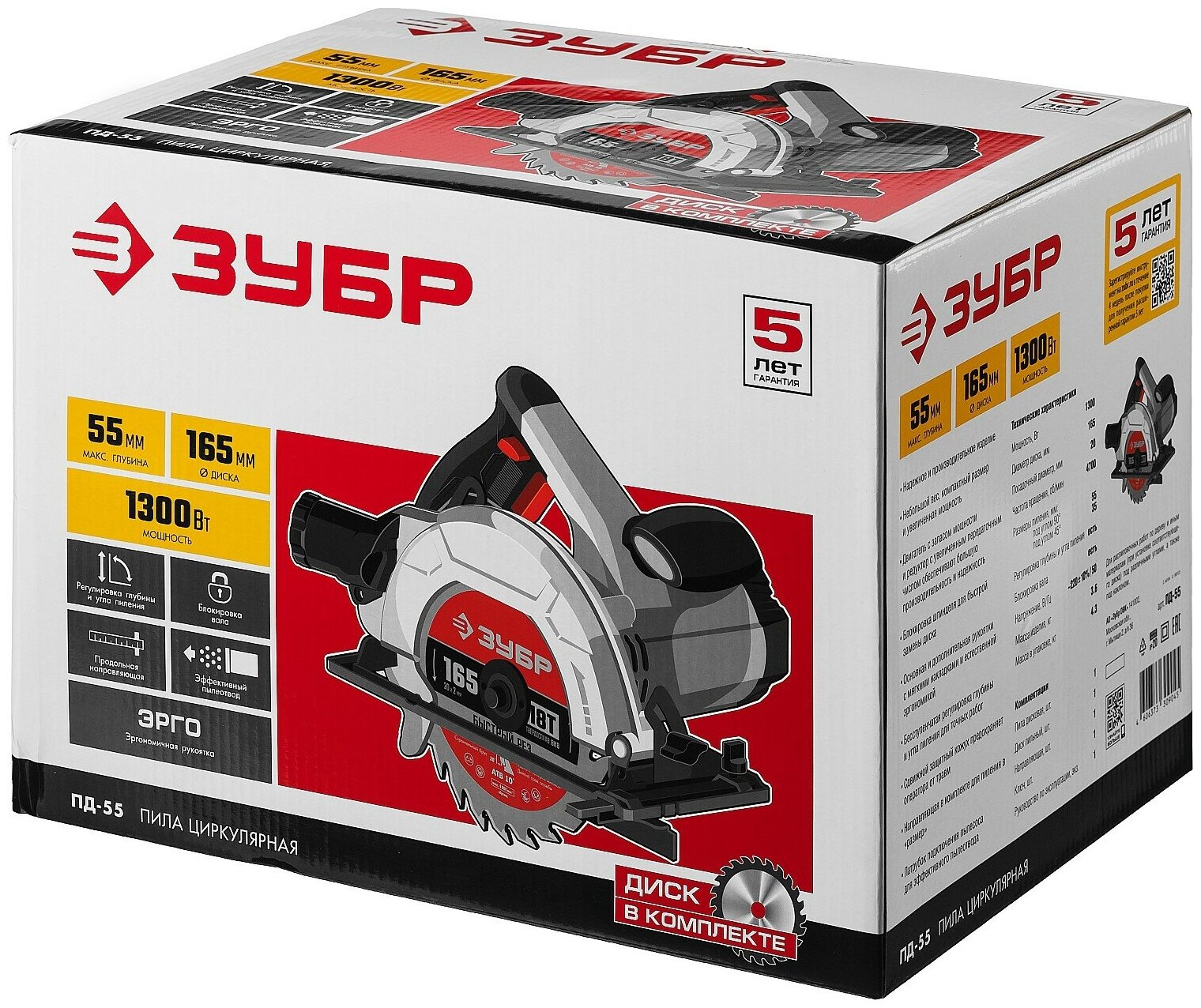 Циркулярная пила (дисковая) Zubr ПД-55 1300Вт (ручная)