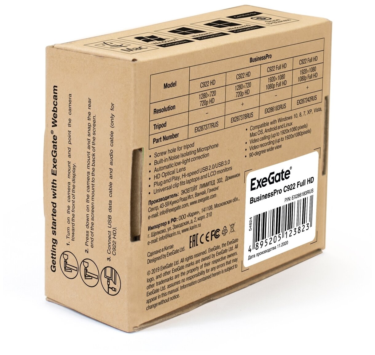 Exegate EX286183RUS Веб-камера ExeGate Business Pro C922 Full HD {матрица 1/3" 2 Мп, 1920х1080, 1080P, USB, микрофон с шумоподавлением, фикс. ф., универсальное крепление, кабель 1,5 м, Win Vista/7/8}