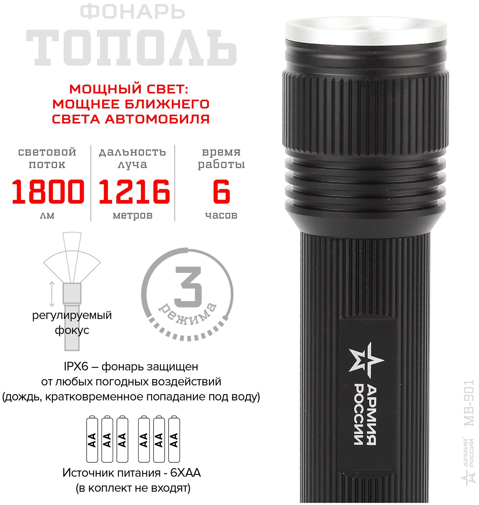 MB-901 Фонари АР армия россии универс. Тополь [20Вт, алюм, рег фокус, IPX6, 6xAA, кор] (6/24/384)
