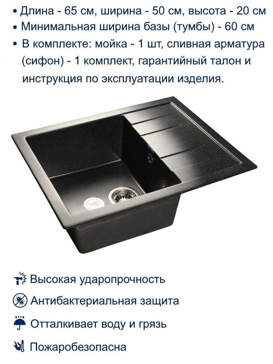 Мойка кухонная врезная, GranFest, Quadro, искуственный мрамор, 650х500 мм, + сифон, черная, GF-Q650L