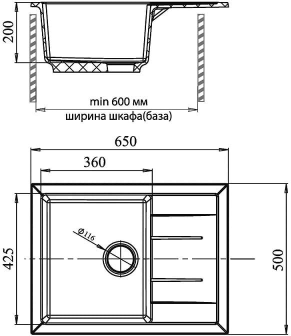 Кухонная мойка GranFest GF-Q650L чаша с крылом 650*500мм черный .