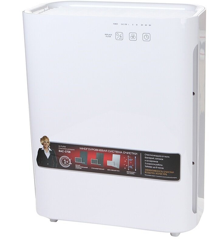 Цена для г. Курчатов. RAC-3708 – современное устройство для очищения воздуха в помещениях площадью до 40 кв. м. Прибор избавляет воздух от пыли, бактерий, всевозможных аллергенов, а также помогает устранить неприятные запахи – например, сигаретного дыма, мусора, косметических аэрозолей. Многоуровневая система очистки RAC-3708 всасывает грязный воздух и прогоняет его через три специальных фильтра и ультрафиолетовую лампу. При такой многоуровневой системе эффективность очистки воздуха достигает 99,95%. Магазины в городе Курчатов смотрите ниже