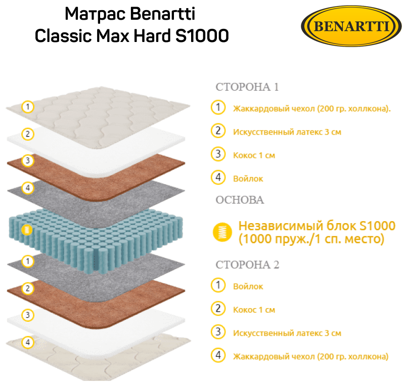 Матрас Benartti Classic Max Hard S1000, Размер 210х205 см