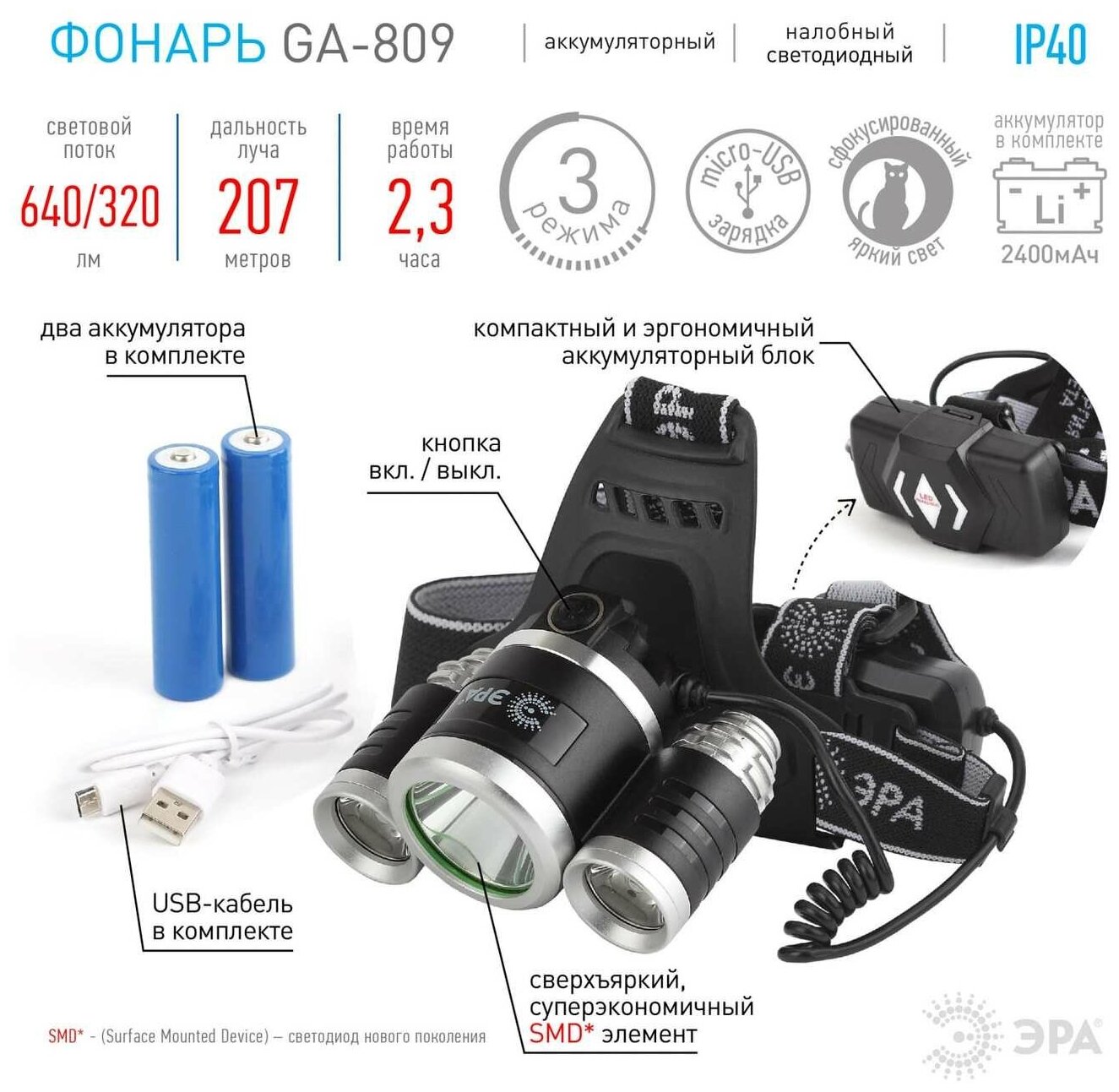 Фонарь налобный аккумуляторный ЭРА GA-809