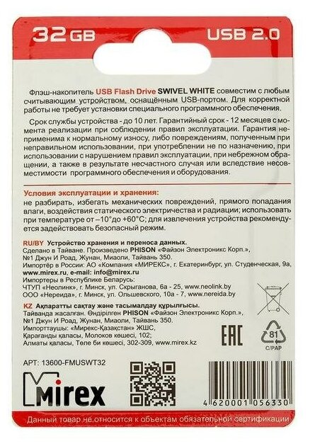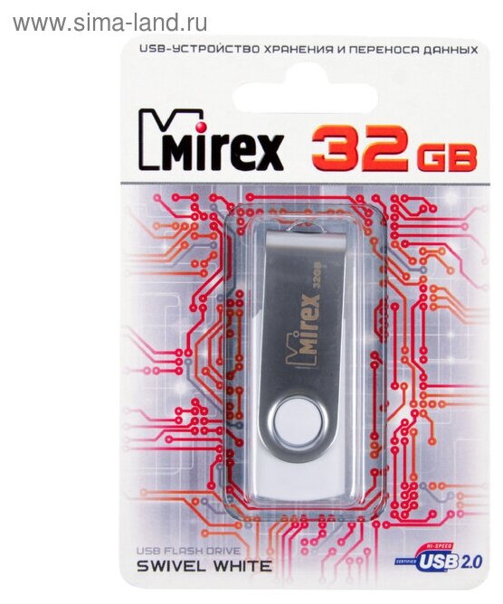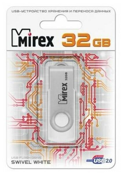 Флешка Mirex SWIVEL WHITE, 32 Гб, USB2.0, чт до 25 Мб/с, зап до 15 Мб/с, белая