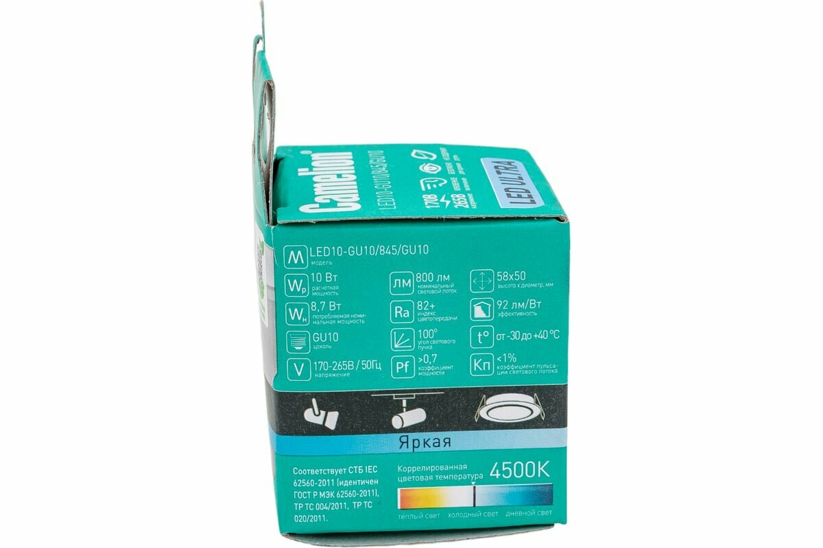 Лампа CAMELION GU10 10Вт 4500K 800Лм 220В LED10-GU10/845 13683, светодиодная, нейтральный белый