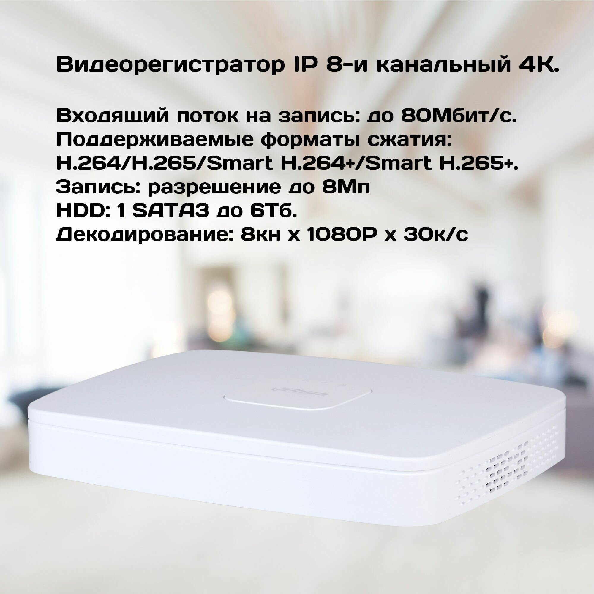 Видеорегистратор Dahua DHI-NVR4108-8P-4KS2/L 8-и канальный 4K, вх поток на запись: до 80Мбит/с, H.264/H.265/Smart H.264+/Smart H.265+, до 8Мп, HDD: 1