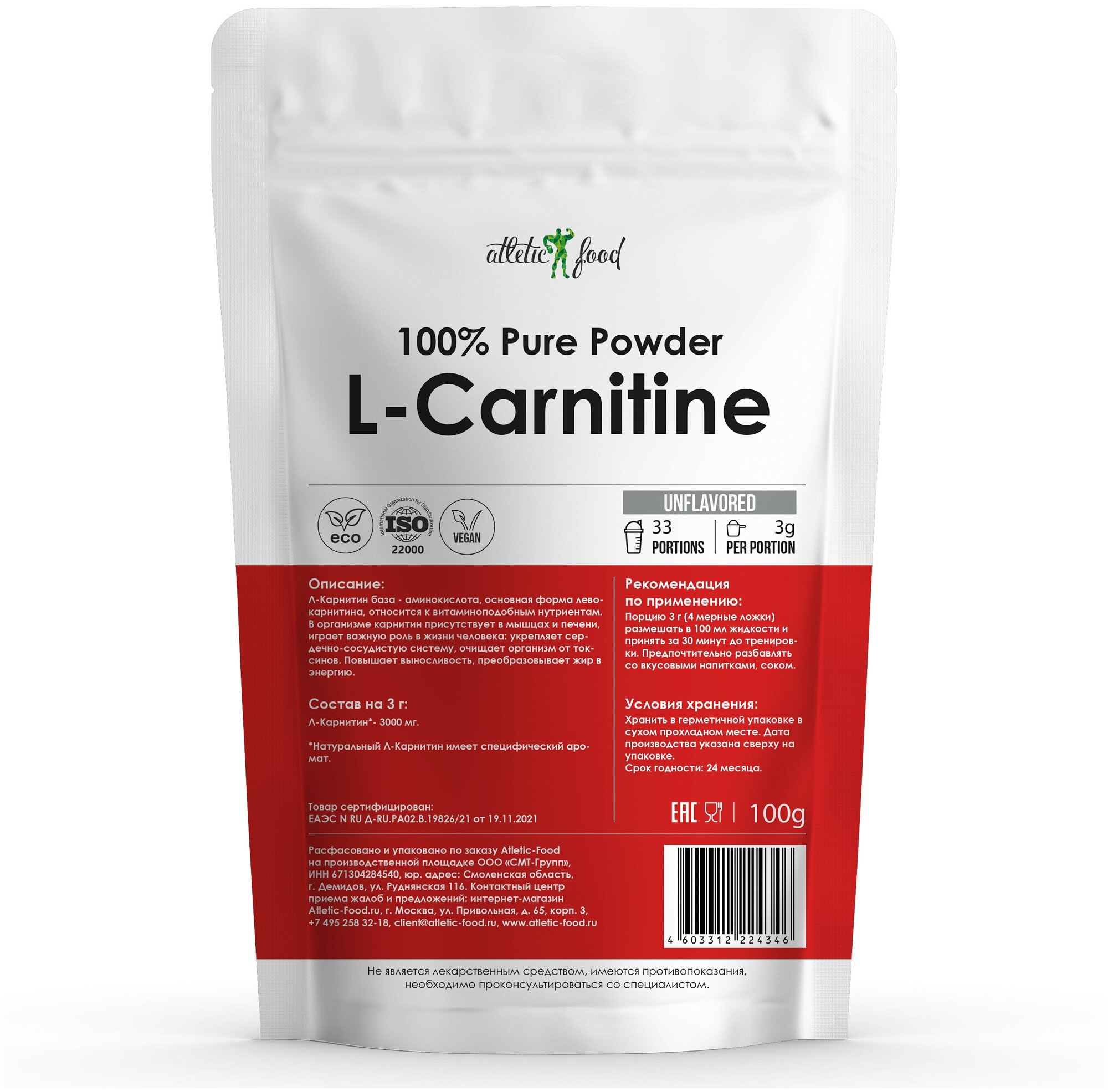 Myprotein Л-Карнитин База для похудения, сжигания жира, выносливости Atletic Food 100% Pure L-Carnitine Powder порошок 100 г, натуральный, без добавок сжигатели жира в Курчатов