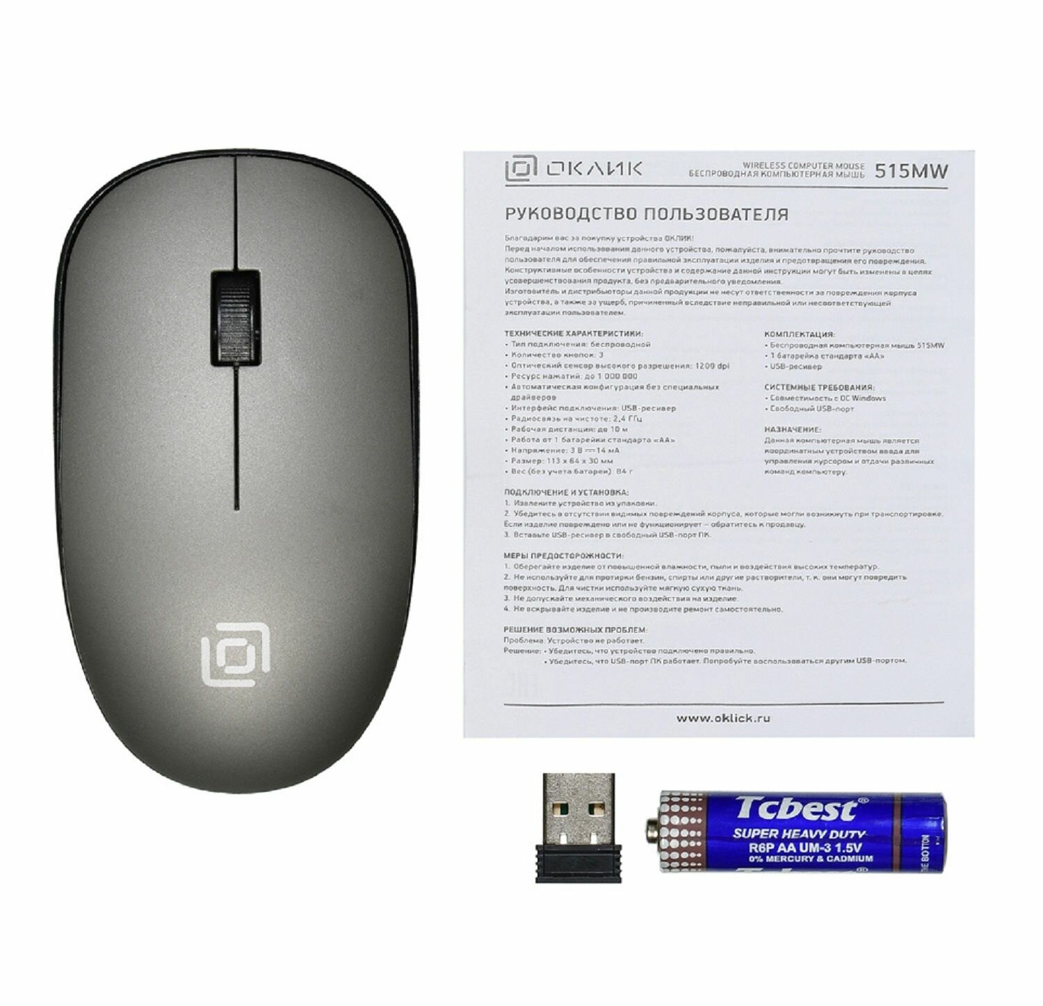 Мышь Oklick 515MW, оптическая, беспроводная, USB, черный и серый [1018267]