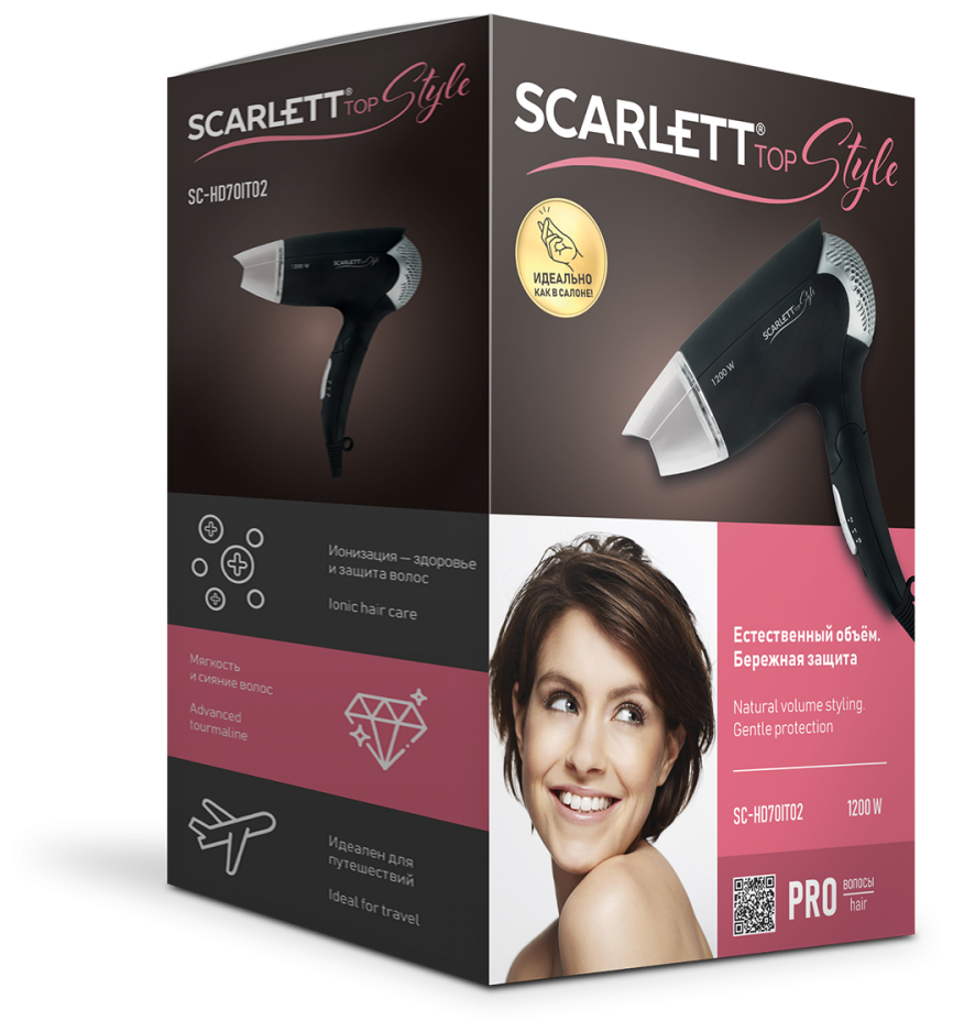 Цена для г. Курчатов. Компактный и недорогой фен Scarlett SC-HD70IT02 отличается простотой и надежностью конструкции. Он отлично подойдет для использования как в поездках, так и дома. Благодаря своим небольшим размерам и складывающейся ручке фен не займет много места в багаже, а прочность сделанного из пластика корпуса не даст повода для беспокойства за сохранность изделия при его транспортировке. Магазины в городе Курчатов смотрите ниже