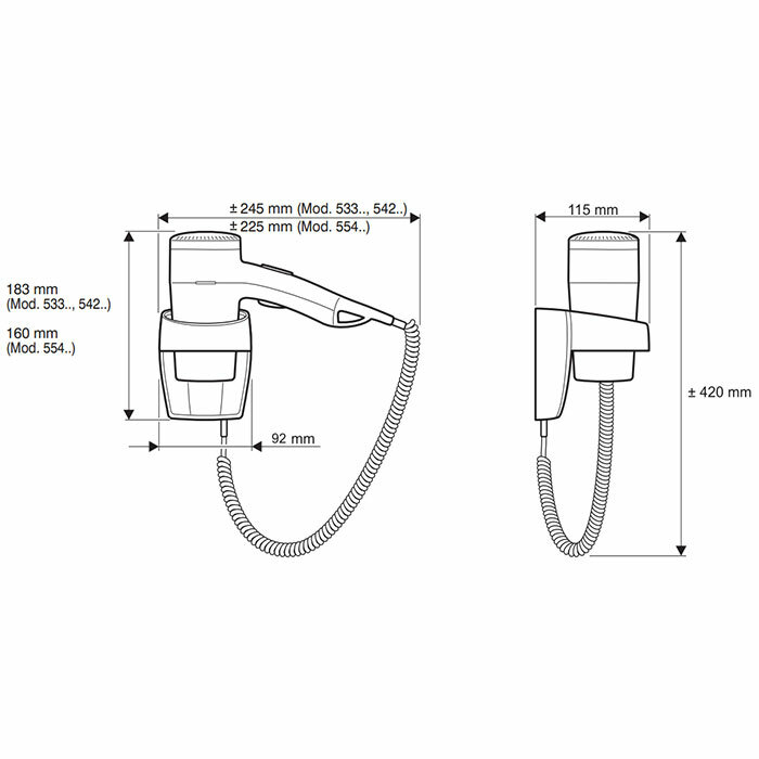 Фен настенный Valera Hospitality Premium 1200 Super (533.03/038A), мощность 1200 Вт, кнопка включения/выключения, профессиональный спиральный кабель, холодный воздух, концентратор, настенный держатель с выключателем