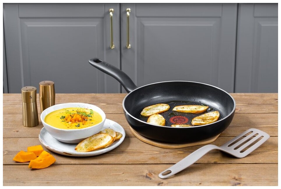 Цена для г. Курчатов. Сковорода Simplissima подарит вам удовольствие от ежедневного приготовления любимых блюд. Посуда оснащена антипригарным покрытием Intensy, которое сохраняет свои безупречные свойства и остается гладким даже при длительном и интенсивном использовании. Покрытие нанесено во Франции и полностью безопасно для здоровья – оно не содержит PFOA, кадмий и свинец. Уникальный индикатор температуры Thermo-Spot показывает, когда сковорода нагрелась до оптимальной температуры и можно начинать готовить. Магазины в городе Курчатов смотрите ниже