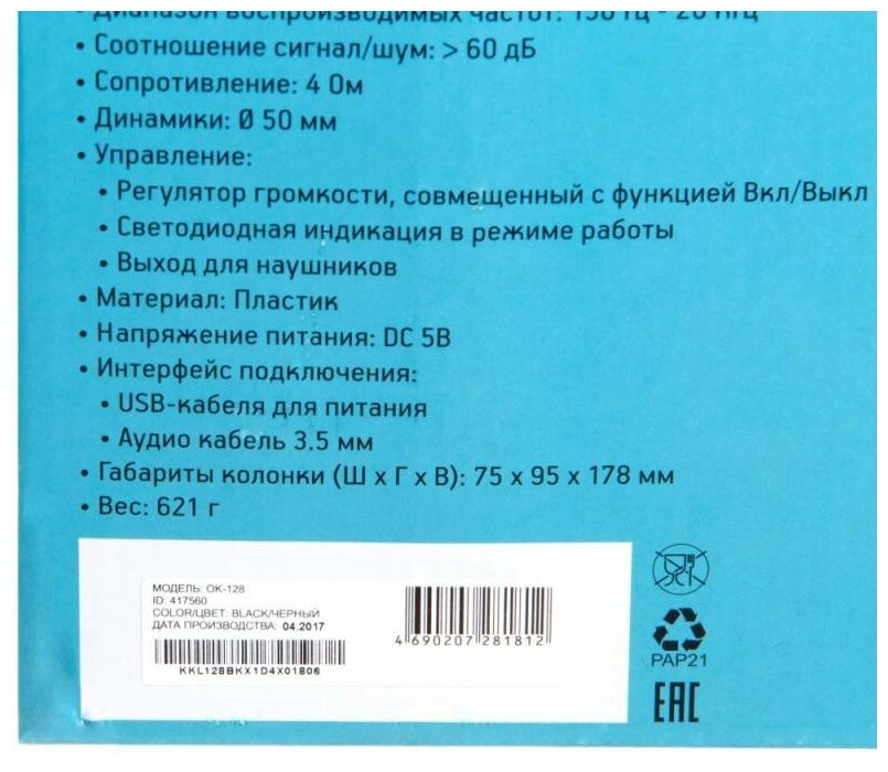 Цена для г. Курчатов. Модель OK-128 Бренд OKLICK PartNumber/Артикул Производителя 417560 Фронтальные колонки (мощность одного динамика) 3 Суммарная звуковая мощность 6 Цвет черный Особенности Световая индикация в режиме работы Материал корпуса колонок (фронт) пластик Тип акустики стационарная Количество полос фронтальных колонок широкополосные Разъем для наушников ДА Пульт ДУ без пульта Общий вес 0.621 Отношение сигнал/шум 60 Количество фронтальных колонок 2 Частотный диапазон 150Гц-20КГц Размеры фронтальных колонок 75x178x95мм. Магазины в городе Курчатов смотрите ниже
